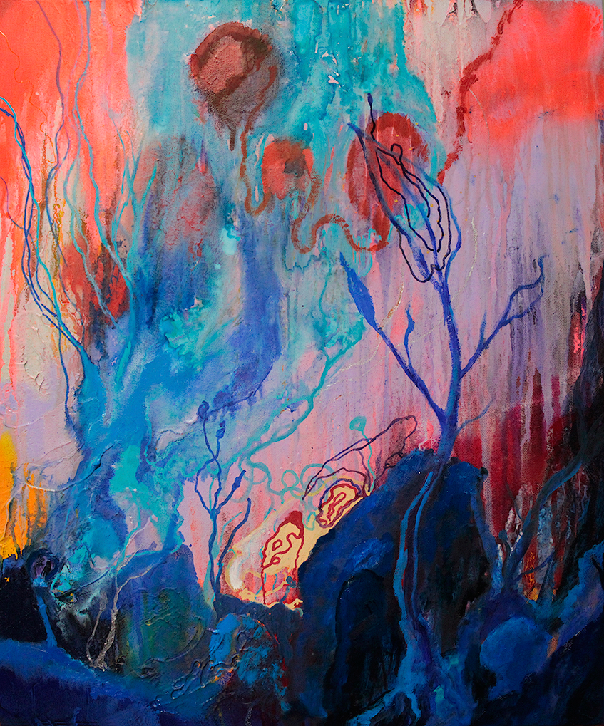 Mixed media (spray paint, acrylic, molding paste, oil paint) 20 by 24 on canvas, availiable for sale.