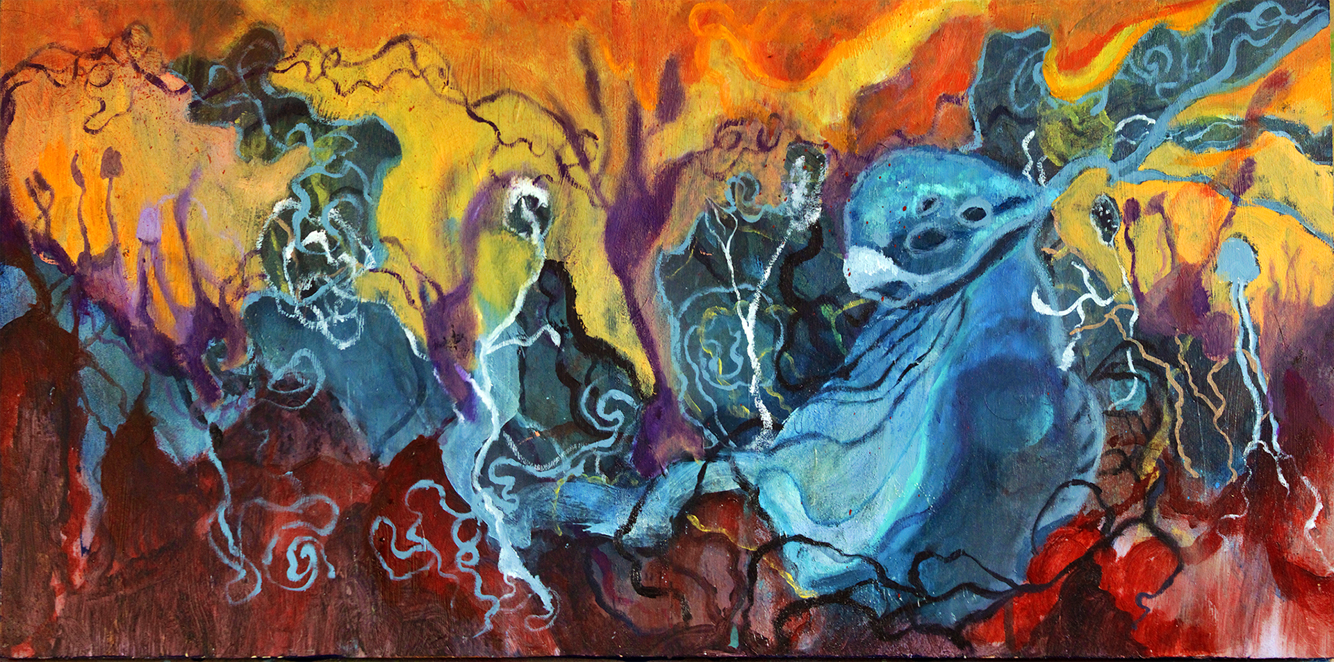24 by 12 on two wooden panels, testors, oil, acryllic and spray paint.